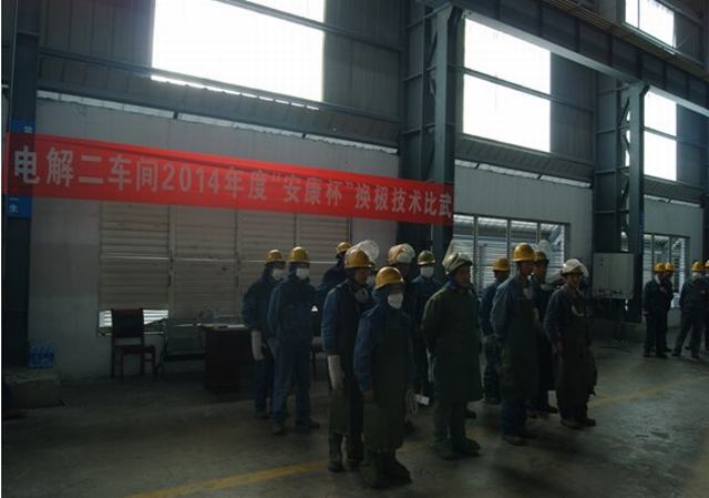 青海物產(chǎn)工業(yè)投資有限公司全面啟動(dòng)"安康杯"競賽活動(dòng)。2014年4月15日上午電解二車間舉行了"安康杯"換極技術(shù)比武大賽。公司副總經(jīng)理張?jiān)手?,副總?jīng)理、工會(huì)主席張秉瑜,總經(jīng)理助理秦建峰出席了開幕式。