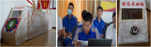 西柏坡精神是部生動的教科書,車間工人黨員袁有德利用平時裝配件的紙盒子,創(chuàng)意性地制做了一列"團結(jié)奮進號"火車,邀請黨員一起乘車前行。袁有德說:"團結(jié)奮進號"列車蘊含著學習西柏坡精神,強企富家、團結(jié)奮進的寓意,車頭前面的"大眾"標識代表公司經(jīng)營的品牌;八個綠色的大美孚機油蓋代表八方來財,所有蓋口都向外代表招攬客戶,減少流失,而且像螺絲釘一樣牢牢釘?。≤囶^車尾標有"勿忘來時路"的字樣,以此提醒廣大黨員干部不忘初心、牢記使命,一定不要忘記來時的路,回顧過去,展望未來,讓"團結(jié)奮進"號列車在西柏坡精神的感召下前行。支部要求,在疫情防控和汽車行車嚴竣的形勢下,我們每一個物產(chǎn)汽貿(mào)員工都是新時代的答卷者,讓"團結(jié)奮進號"奔馳在新時代的征程上,承載著中國夢、物產(chǎn)夢,承載著物產(chǎn)汽貿(mào)職工群眾對美好生活的向往,風馳電掣,勇往直前,奔向未來!