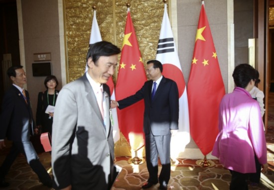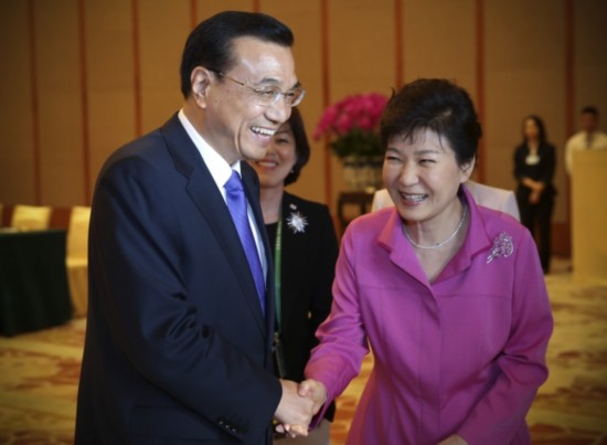 韓國總統(tǒng)樸槿惠對李克強總理表示:"韓中日三國合作有利于地區(qū)和平穩(wěn)定。要引導(dǎo)日本抱著正確的歷史觀,為東北亞和平做出貢獻。"